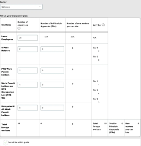 When applying for WPs and S Passes, companies may log into the MOM website to automatically calculate compliance with quotas based on industry and employee count, preventing overages.