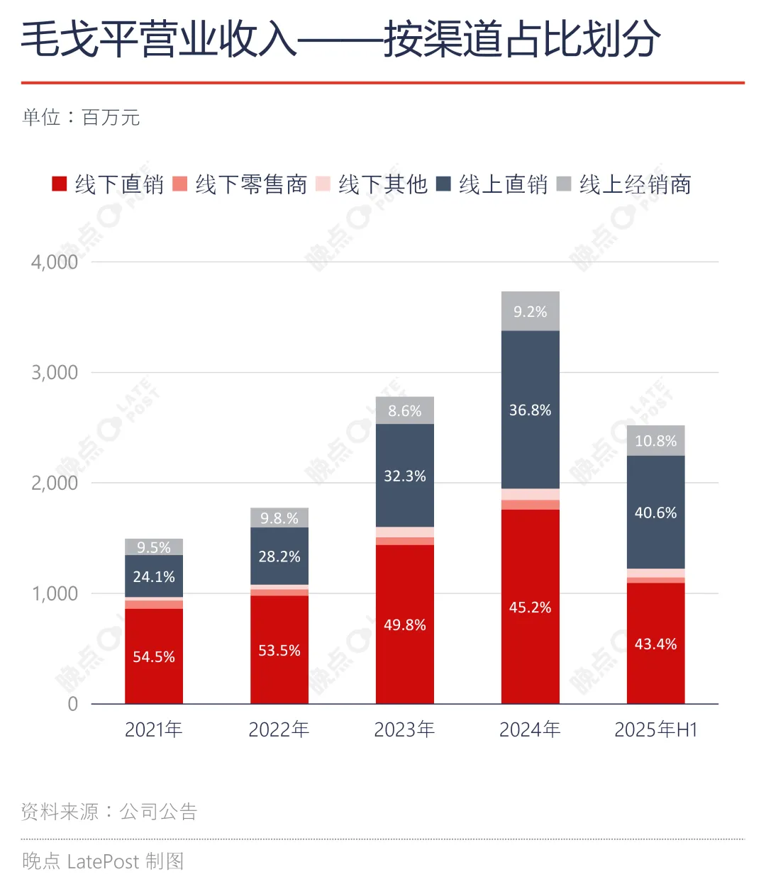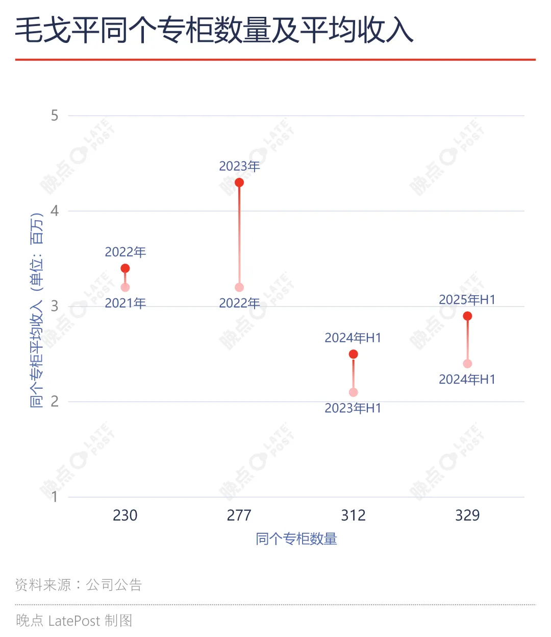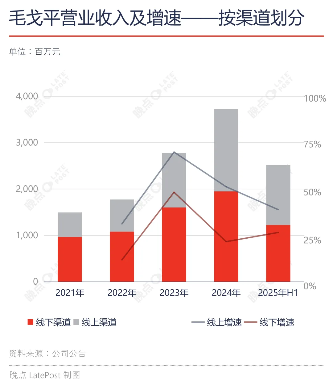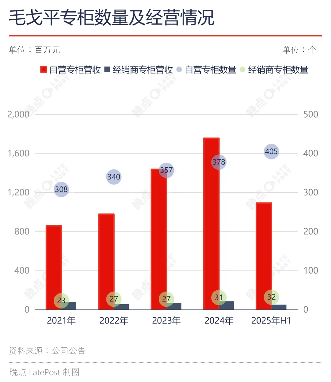 Maogoping’s channel strategy is also noteworthy.2025In the first half of the year, ithas405self-operated countersand32distribution counters, distributed inmore than120citiesin China. Although the growth rate of counters has been relatively slow in recent years, the increase in ping efficiency has led to high growth in offline channels.