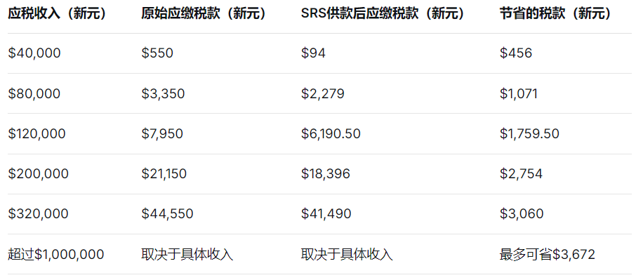 As you can see from the table,whenthe annual taxable income isS$80,000, you can save aboutS$1,071in taxes; and when the income is more thanS$1 million, you can save up toS$3,672in taxes.