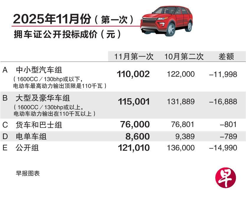 In the first round ofNovember bids,GroupACOEsold for aboutS$110,002,GroupBfor aboutS$115,001andGroupE (Open Group) forS$121,010.