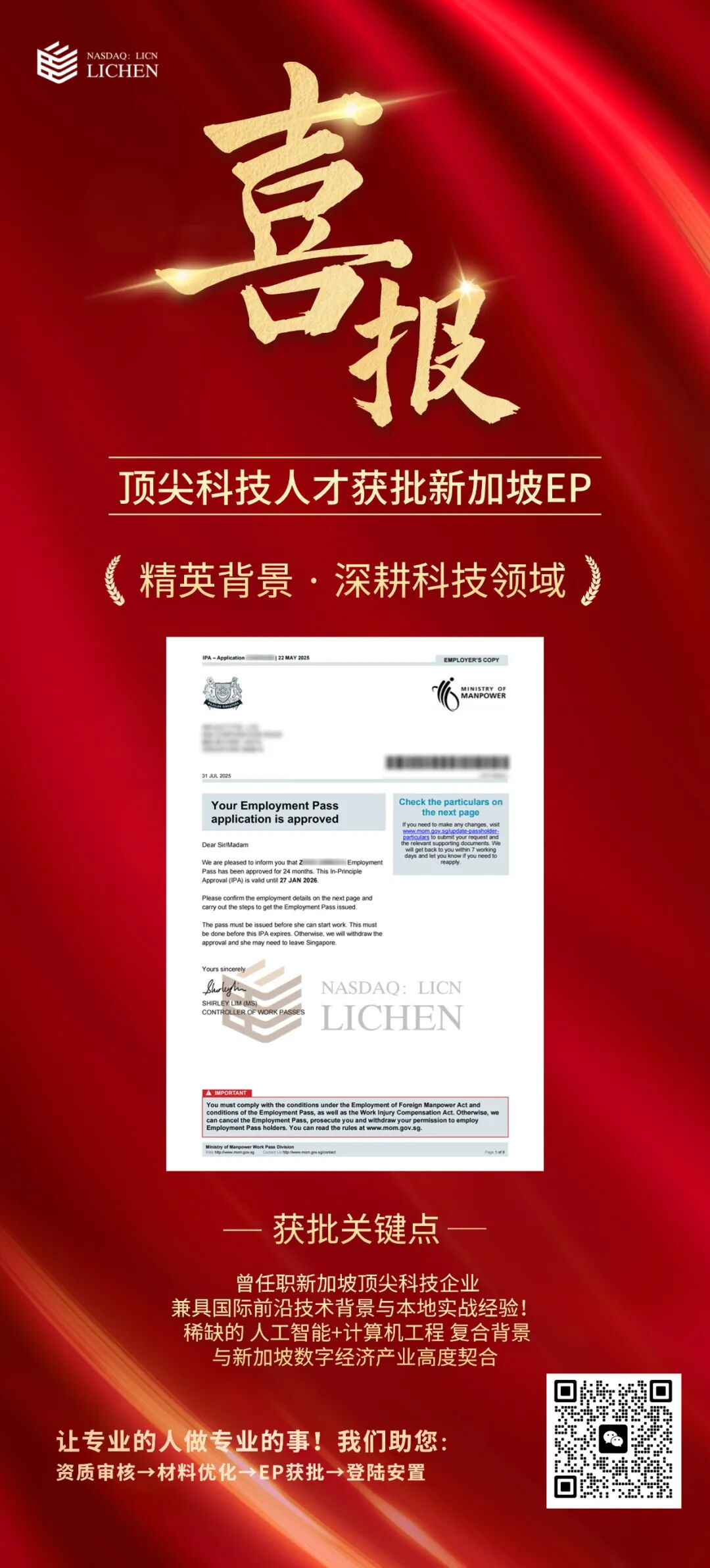 With a degree in electronic engineering from Jiaotong University, practical experience in Singapore’s top technology companies, anda composite background of AI+financial science and technology,Mr.Z has successfully obtained theapproval ofMOM, and the whole process is precisely escorted, with2years ofEPquickly arriving, leading the new trend of immigration of scientific and technological talents.
