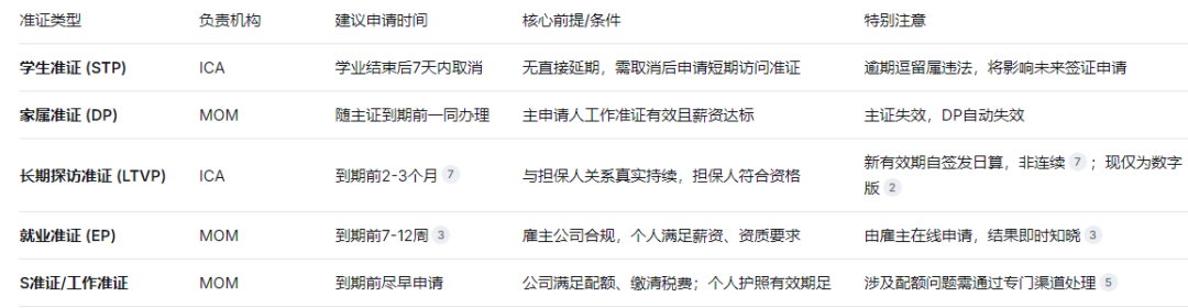 ①家属准证(DP):依附于主要工作准证(如EP、S Pass)。申请延期的前提是主申请人的工作准证已成功续签,且其薪资等条件继续满足为家属申请DP的要求。申请需由雇主或主申请人通过MOM的在线门户提交。