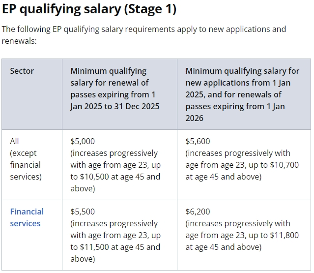 非金融服务业申请者月薪最低5,600新币,金融服务业6,200新币,且随年龄递增至45岁以上分别最高10,700与11,800新币。若月薪未达标,申请将直接被拒。