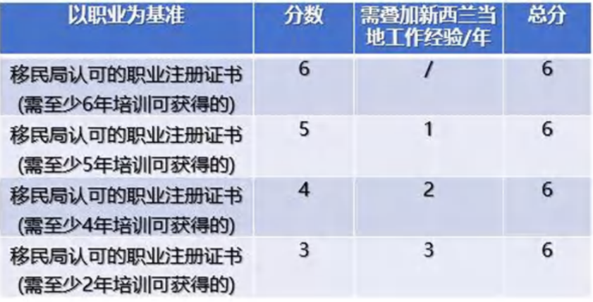 主项(任一):新西兰职业注册、认可学历、或收入达到标准,可得 3–6 分。