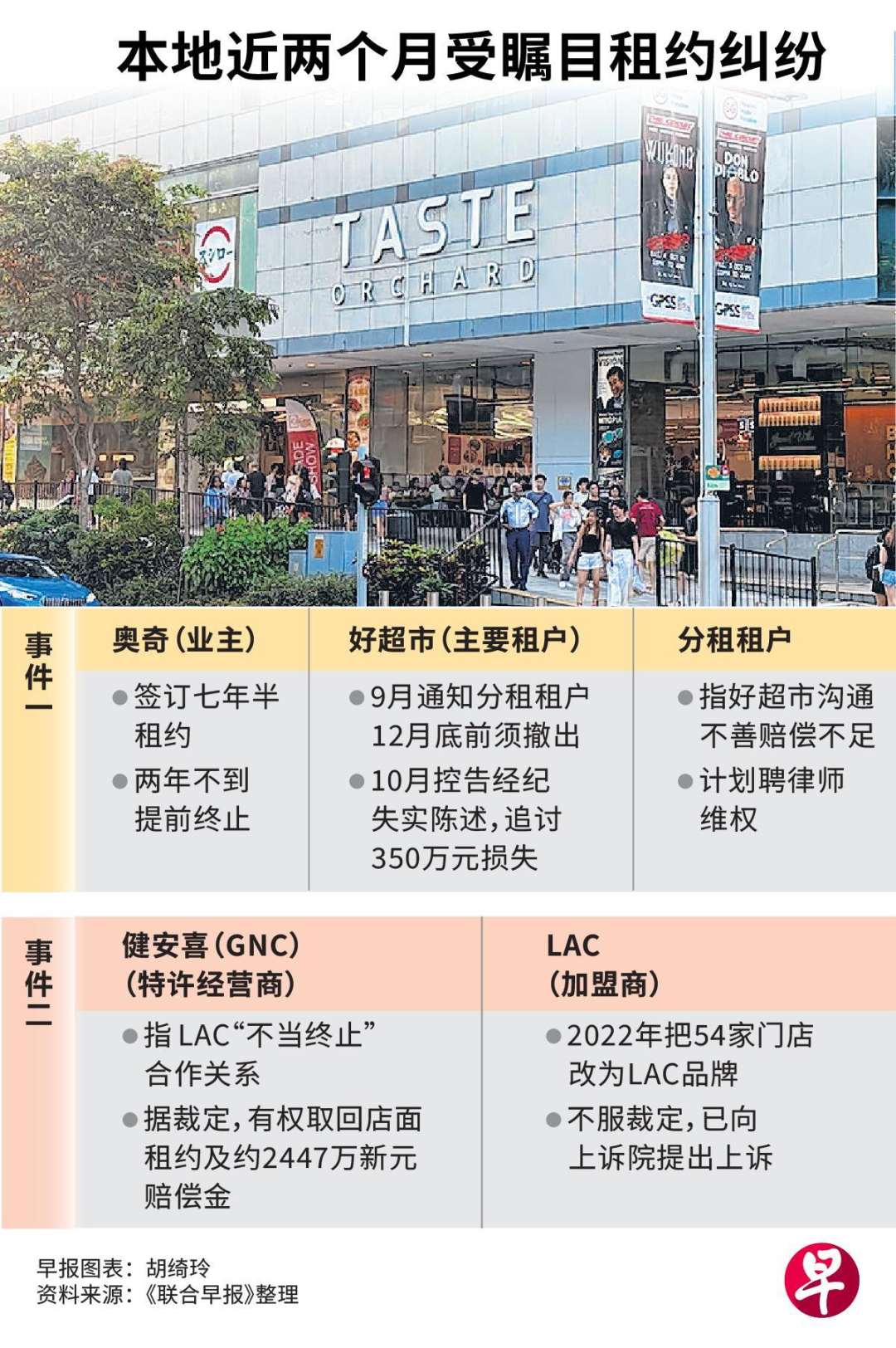 好超市作为主租户,在 Orchard Road 的 Taste Orchard 商场与业主 OC Retail Properties Pte Ltd(简称「奥奇」)签订“七年半”租约,经营约18 个月后,奥奇突然终止主租约,要求租户最迟年底将店面恢复原状交还。这令租户与其下的分租户猝不及防。
