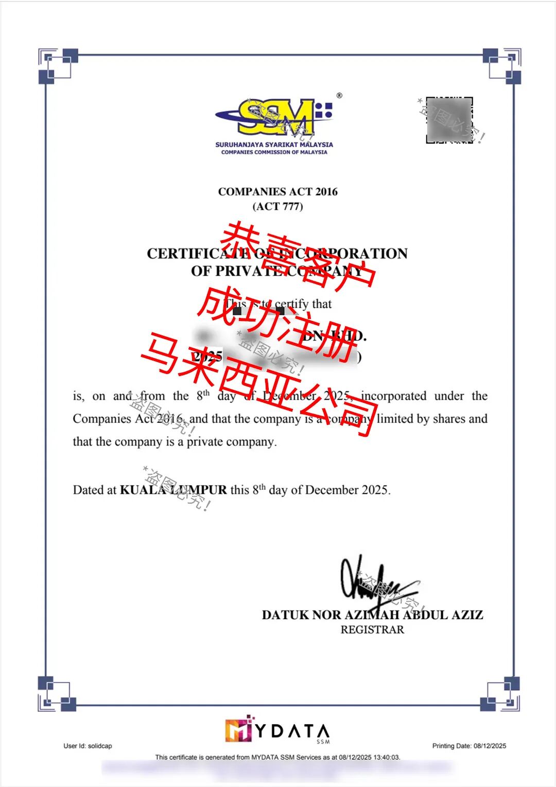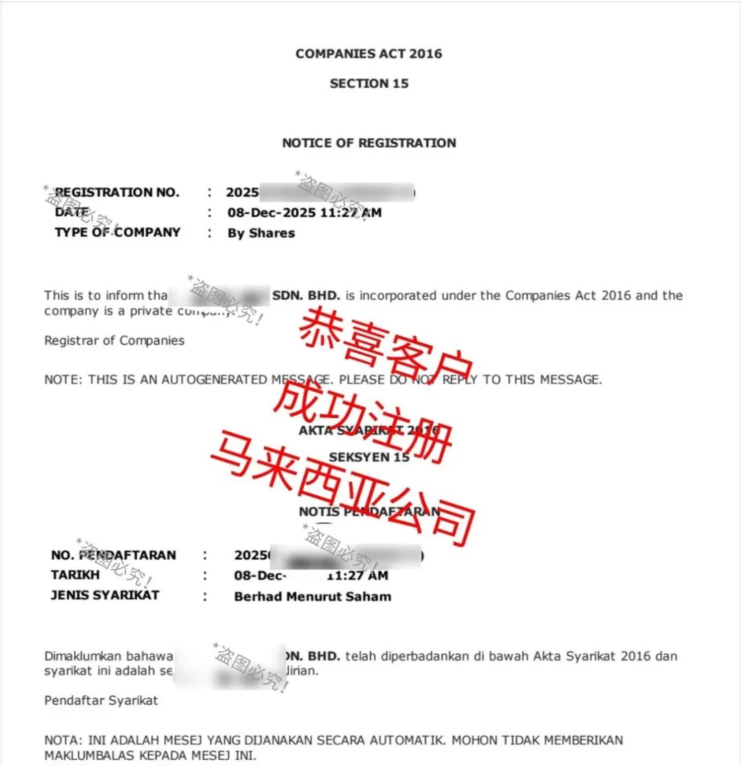 图/客户成功注册马来西亚公司,盗图必究!