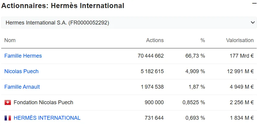 图/截至2025年3月12日的爱马仕主要股东构成,皮埃什当时仍被列为最大个人股东,来源:南风窗