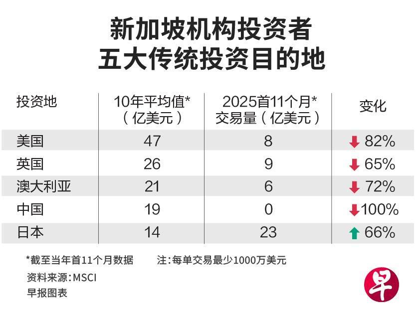 MSCI数据显示,2025年首11个月,日本成为新加坡机构投资者唯一增长的传统投资目的地,投资额达23亿美元,较过去十年平均值增长66%。这一增幅与美国、英国、澳大利亚和中国市场的全面下滑形成鲜明对比。