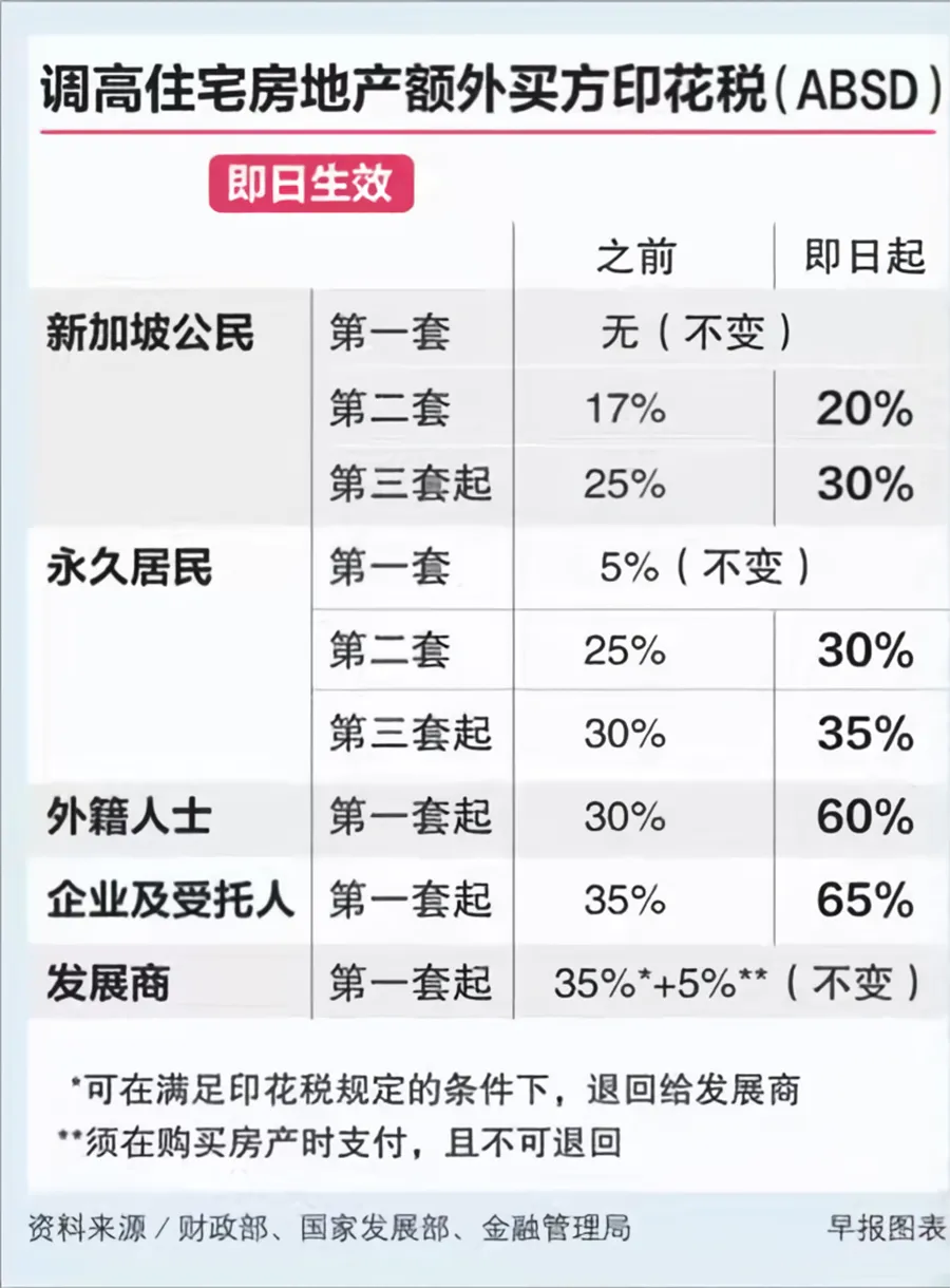 太平洋另一端的新加坡,采取了截然不同的调控路径。2025年,新加坡将外籍人士购买住宅的额外买方印花税(ABSD)从30%提高至惊人的60%,企业和信托购买房产的税率也提高至65%。